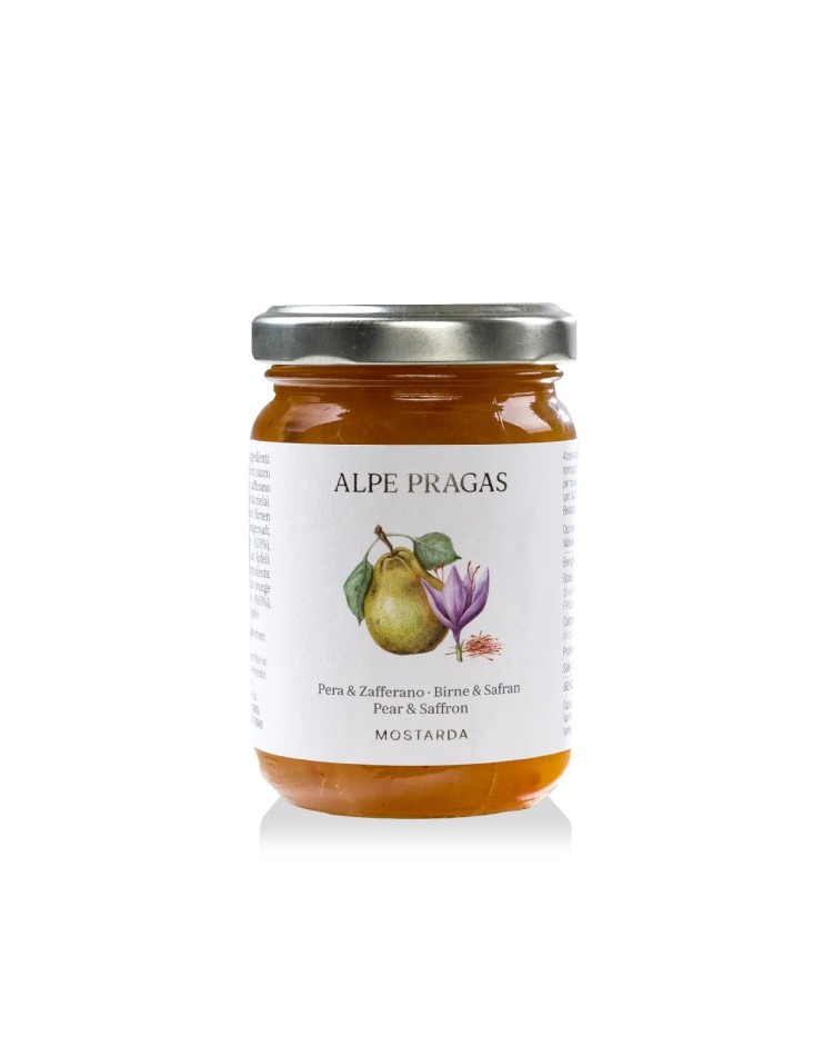 Mostarda Birne & Safran - Eine fruchtige Kombination aus lieblicher Birne und edlem Safran. Alpe Pragas empfiehlt: herrlich zu Frischkäse, vor allem frischem Pecorino. Eine ideale Beilage zu hervorragendem Käsefondue.