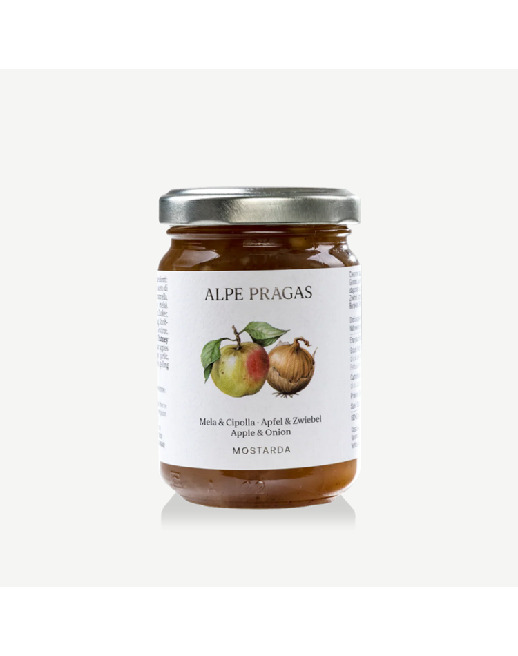 Apple and Onion Chutney - Spicy combination of apple & onion, rounded and refined with spices. Alpe Pragas recommends: Delicious to well matured mountain cheese, ripened sheep cheese and cooked meat.