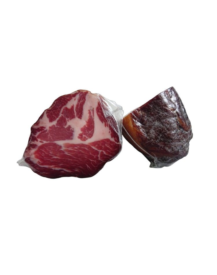 Today as at that time we process after traditional production procedure nearly all parts of the pig, e.g., the leg, the square, the pork nape, the belly, the shoulder and the cheek. In addition to this already very unusual assortment we still produce the traditional farm bacon which is produced without exception of local pigs. This is marked as a rule with our fire sign belonging to company. Because of the different bandage fabric of the single meat parts we are able with the use of one single salt/herbs-mixture to give this one own individual character and taste.